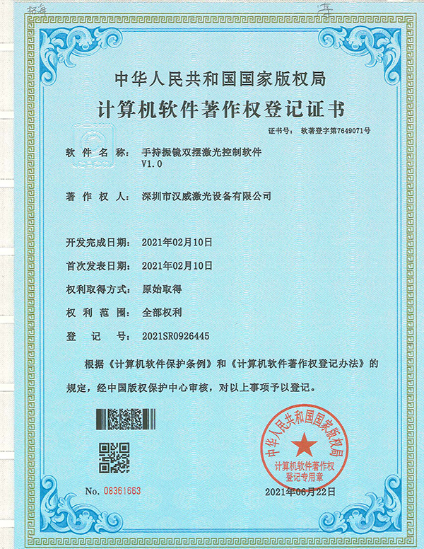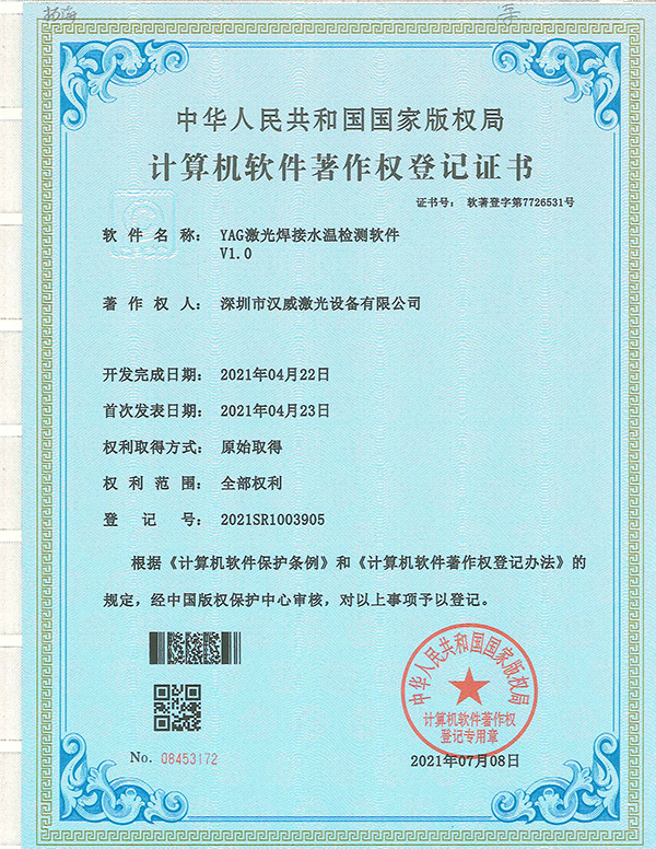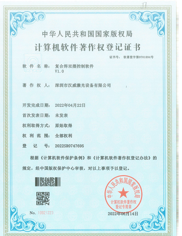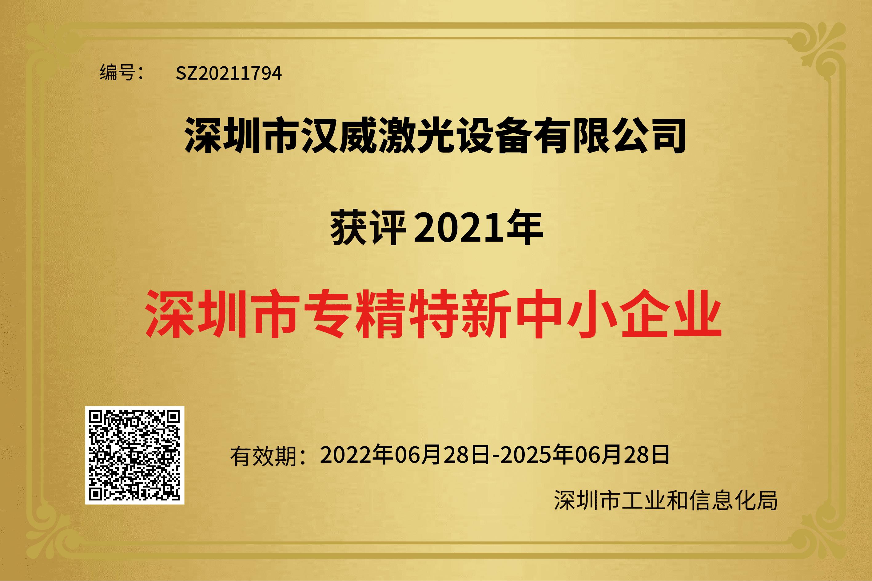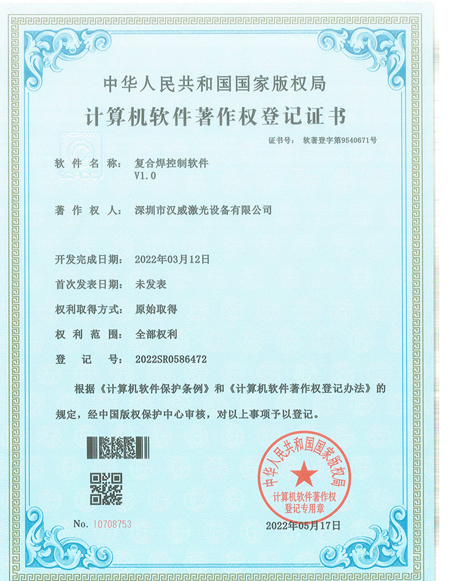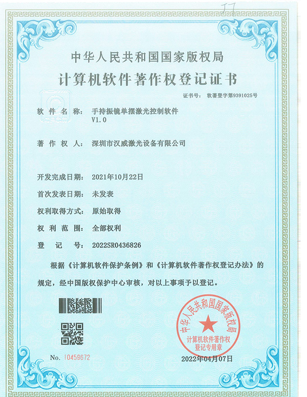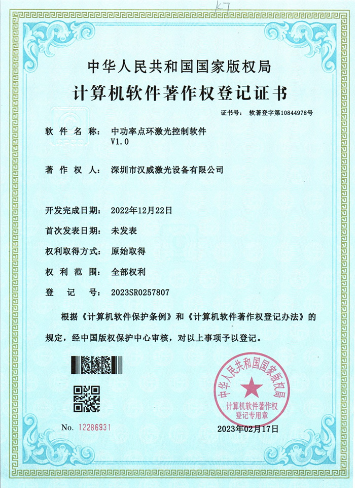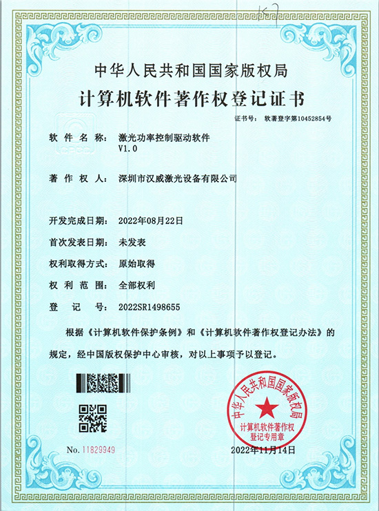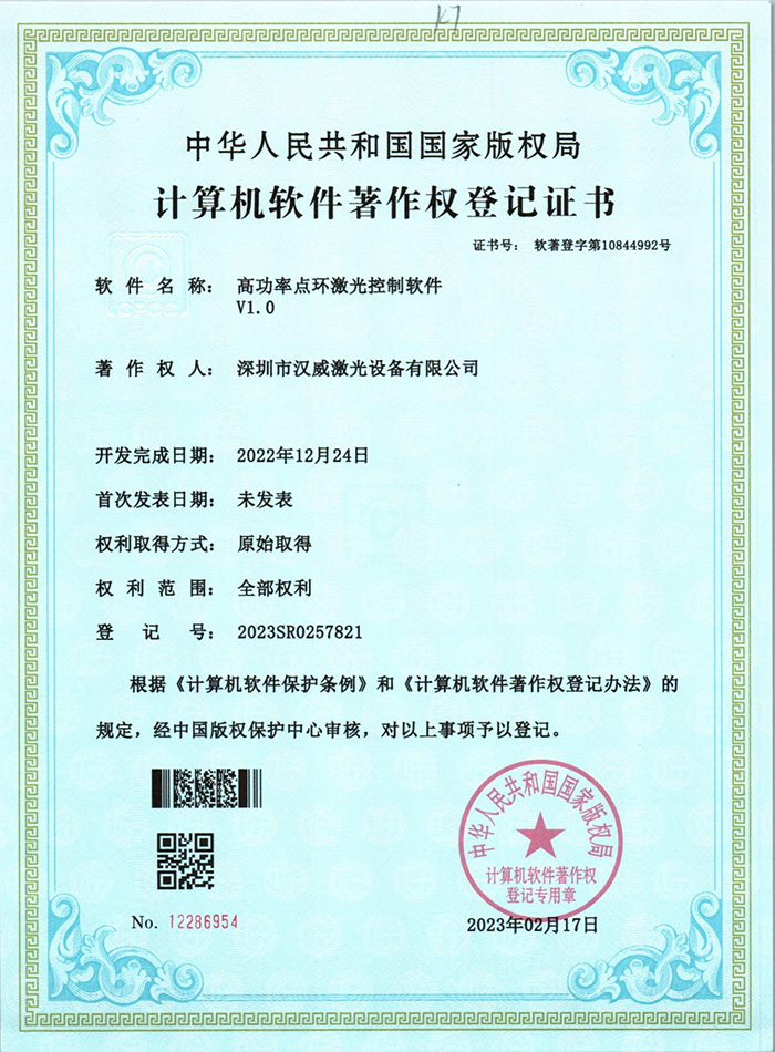 漢威激光目前已獲得國家授權(quán)專利44項(xiàng),其中發(fā)明專利已授權(quán)3項(xiàng),軟著23項(xiàng),另外在審發(fā)明專利3項(xiàng); 公司潛行發(fā)展多年,漢威激光于2019年被評為“高新技術(shù)企業(yè)”;2022年被評為“規(guī)上企業(yè)”、“專精特新企業(yè)”,同年再次被評為“高新技術(shù)企業(yè)”,2023年獲得了“ISO9001質(zhì)量體系認(rèn)證”;